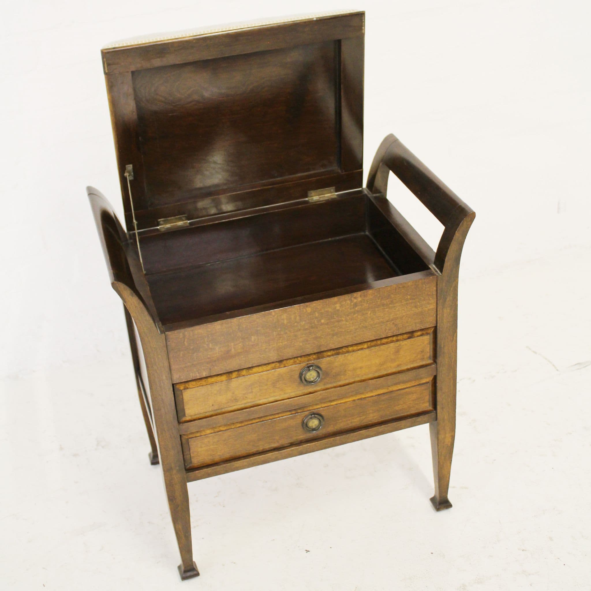 Solo music stool with handles, lift open seat to music storage and 2 drop fronted drawers with ring pull handles, darker walnut finish and cream seat. Antique