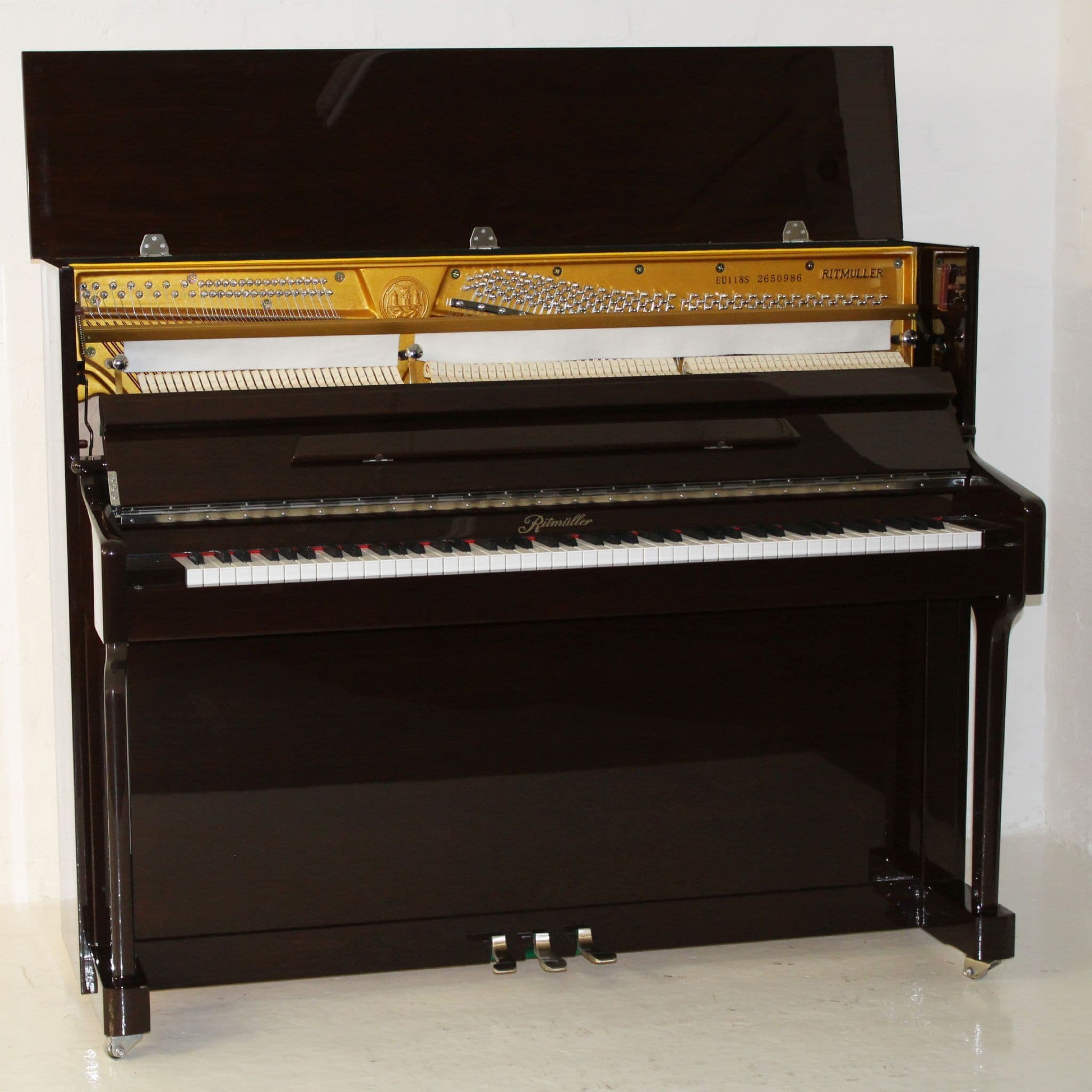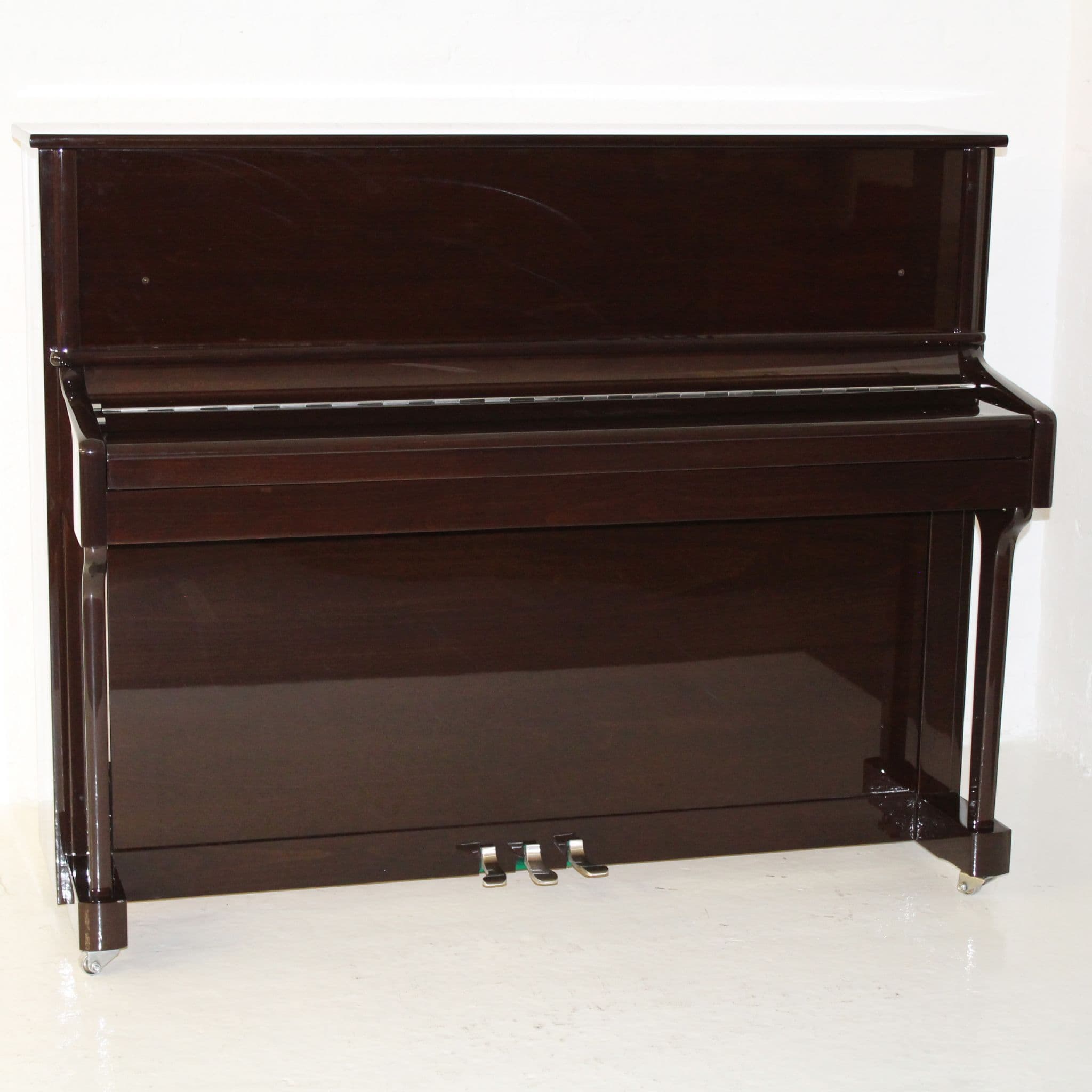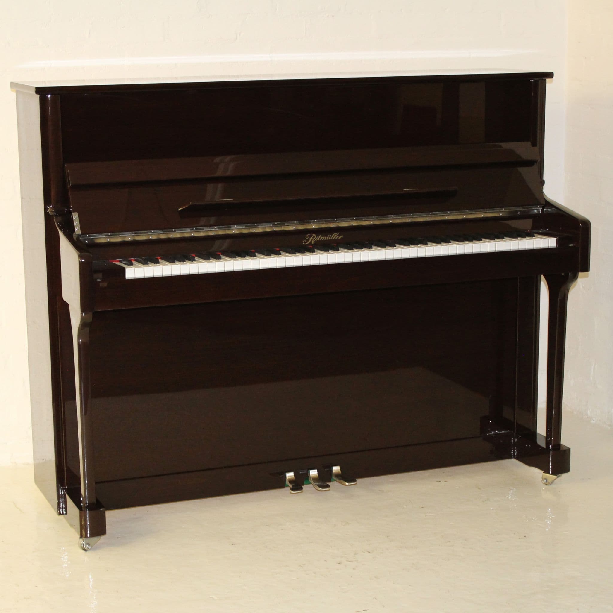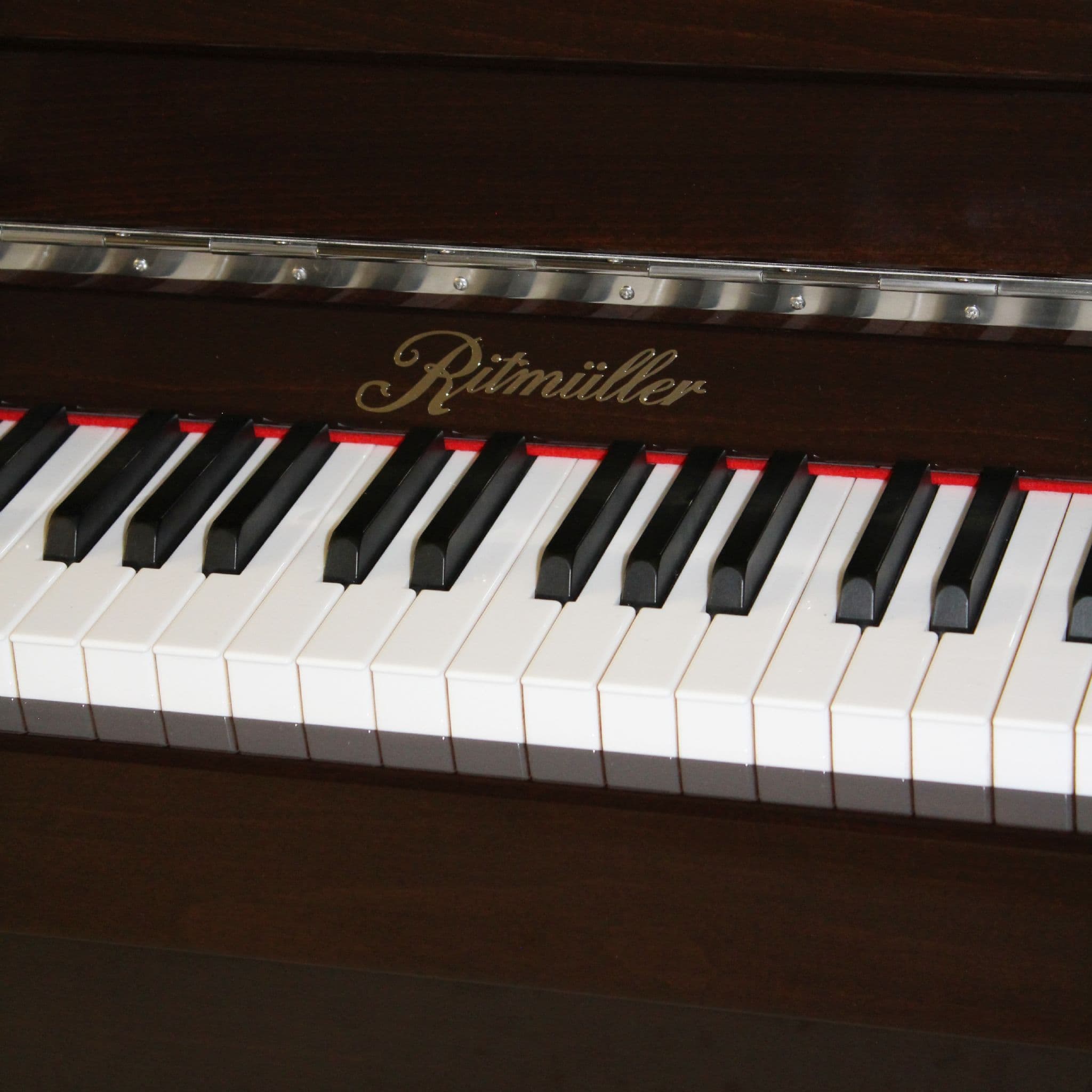 Ritmuller 118cm Traditional Upright piano in walnut polished finish with chrome fittings c2019 Ex rental